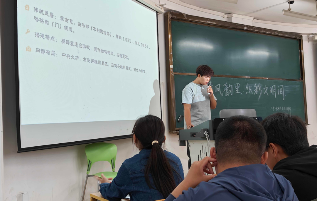 智建2501班的蒙古族学生刘珩平与包戴钦共同带来分享。他们介绍了蒙古族主要分布在内蒙古自治区,蒙语和蒙文传承悠久。展示了镶有皮毛的蒙古袍,介绍了手扒肉、奶茶等民族饮食,以及蒙古包的搭建特点、那达慕大会的竞技项目。现场播放了马头琴曲目,让同学们沉浸式感受了蒙古族文化的豪迈与灵动。